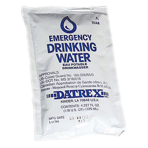 Water For your Go-Kit When you are "on the run" you want your water to be handy. And, I hate changing out water bottles every 6 months. So here is my favorite option. These Coast Guard approved water pouches have a 5 year shelf life. Stick a few in your go-pack and your are really "good to go"! Click on the image below for my favorite supplier *.